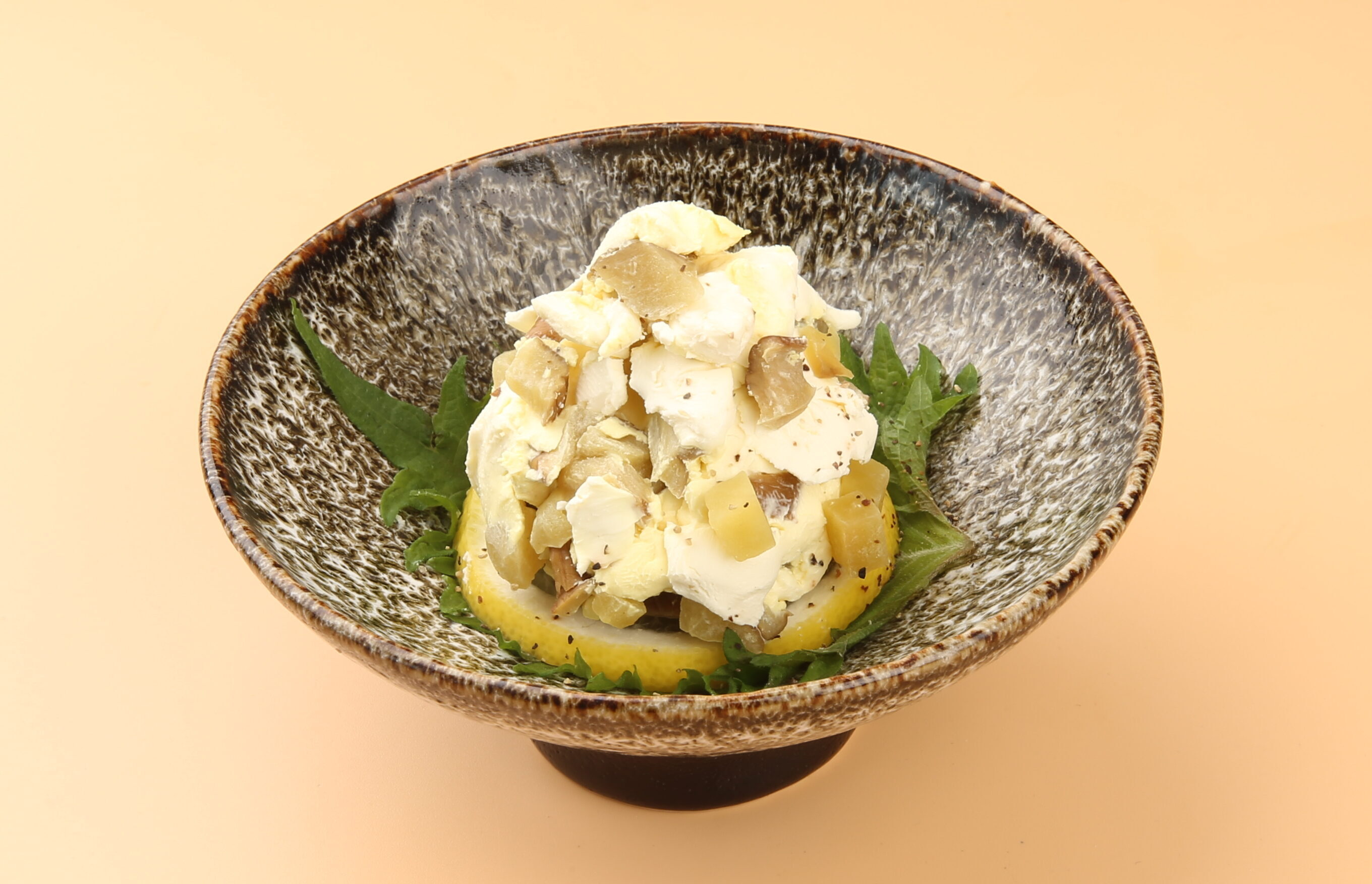 燻製の香りが楽しめる燻りがっこを、まろやかなクリームチーズで和えて、スモークチーズのような濃厚な味わいに仕上げた一品。