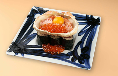 カニの甲羅にエビの身とズワイガニのほぐし身入り。細巻きの上にのせてディップの様にして食べる幸せ。