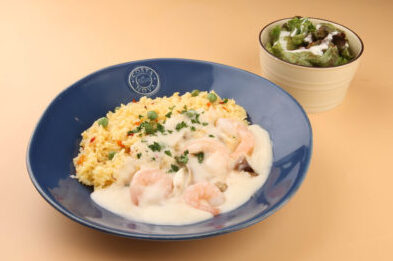 ぷりっとした食感の海老を使用し、まろやかなクリームソースで優しく仕上げた洋風ピラフ。
